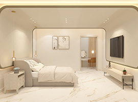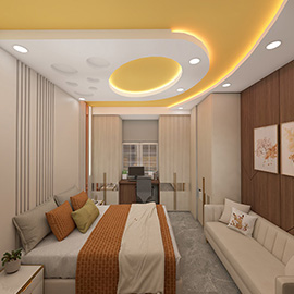 A false ceiling design for bedroom costs between INR 75-120 per sq/ft, depending on the design and the thickness of the board being used for the false ceiling.